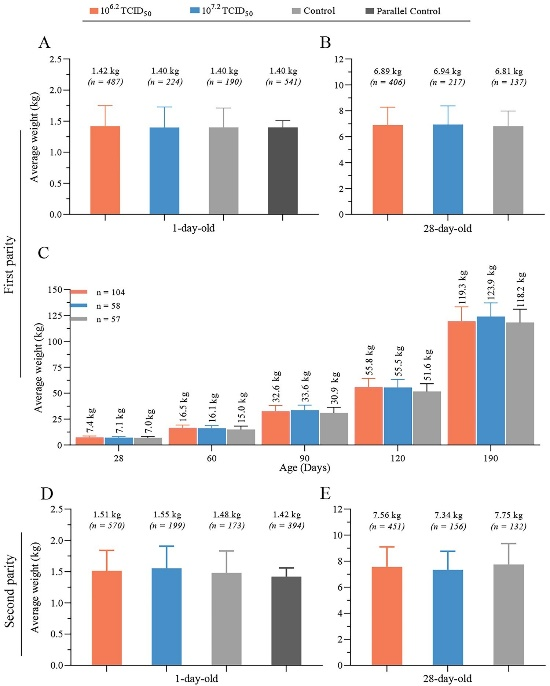 针对头胎仔猪的育肥跟踪显示,选取的 219 头仔猪育肥至 190 日龄时,推荐剂量组、10 倍超剂量组和对照组的平均体重分别为 119.28kg、123.94kg 和 118.24kg,三组之间无明显差异,且均达到了同品种、同养殖条件下商品育肥猪的正常增重水平,全程仔猪生长发育良好,无任何急性、慢性临床不良反应,说明疫苗接种不会影响仔猪的生长速度和育肥性能。