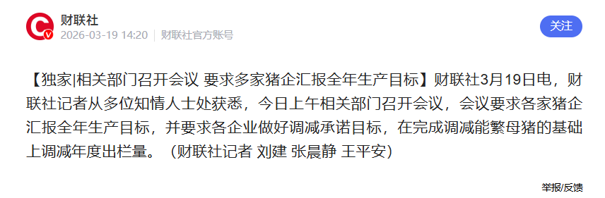 会议首要聚焦行业过剩产能化解与精准监管底数梳理,一方面要求各家猪企全面梳理并如实汇报 2026 年度生猪生产目标,核心涵盖能繁母猪存栏计划、生猪年度出栏总量等关键数据,同时进一步明确了中大猪统计数据的统一口径,解决此前行业数据打架、监管底数不清的问题,确保上报数据可核查、可追溯,为政策精准调控提供真实可靠的支撑;另一方面明确要求各企业作出产能调减承诺,在优先完成能繁母猪存栏量调减目标的基础上,同步合理调减 2026 年度生猪出栏量,从供给源头压缩过剩产能。