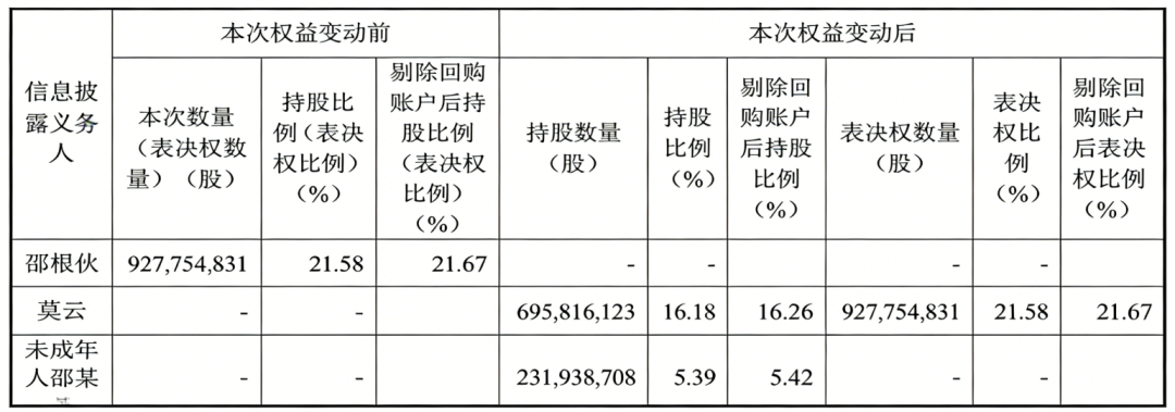 同时,公告显示,鉴于莫云是未成年女儿邵某某的法定监护人,未成年女儿邵某某持有的公司股份的权利由莫云行使,莫云合计持有公司表决权9.28亿股,占公司有表决权股份总数的比例为21.58%,足以对公司股东会决议产生重大影响。因此,本次权益变动后,公司控股股东、实际控制人变更为莫云。