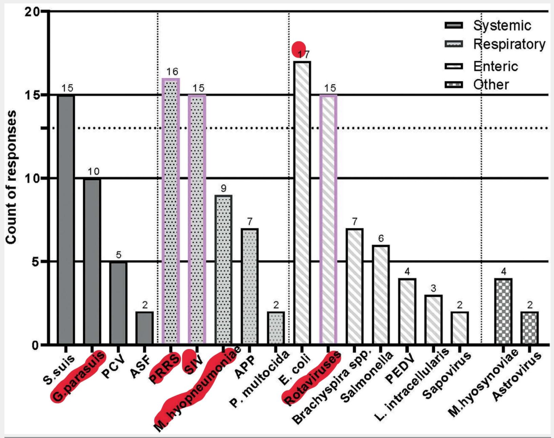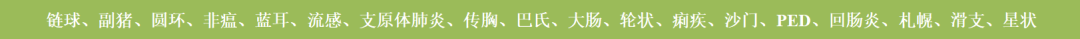 TOP10排名:大肠(腹泻)>蓝耳>流感=轮状=链球>副猪>支原体肺炎>传胸=痢疾>沙门