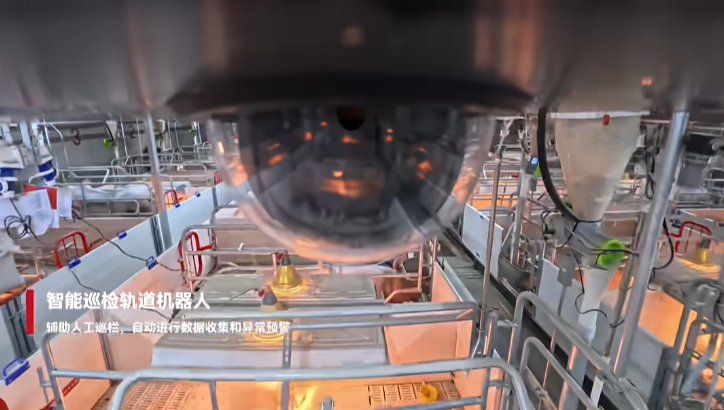 健康管理这块,变化更大。咱们养猪的都知道,一天巡栏下来,少说两三万步,看精神、看粪便、看采食,靠的是眼睛和耳朵。现在一些场子里,轨道巡检机器人成了标配。机器人挂着鱼眼摄像头、热成像、3D摄像头,自己沿着轨道跑,能盘点猪数、估体重、看背膘,还能测体温异常。