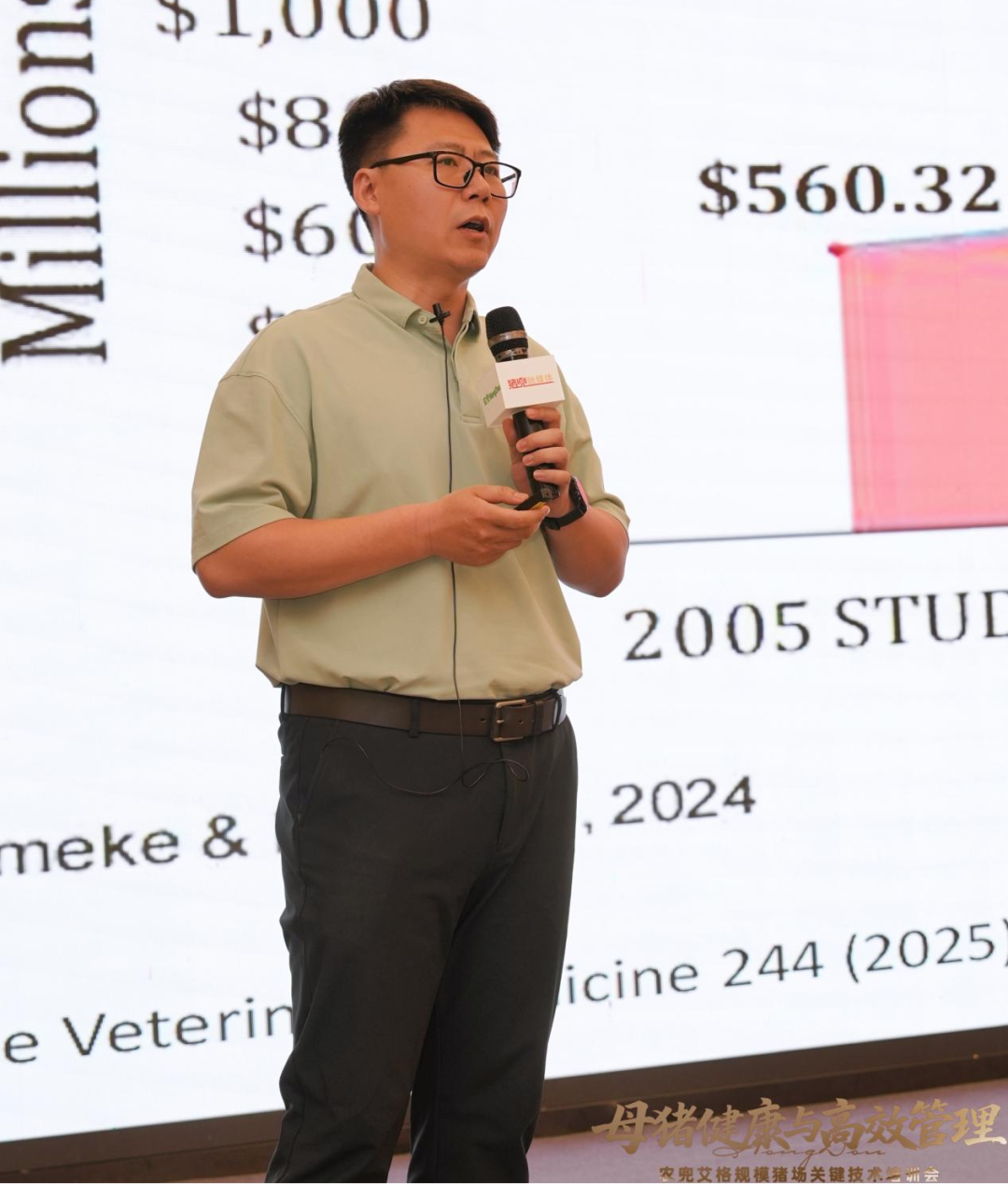 牟小东博士作为中英合资伊科拜克技术服务经理,深耕猪场疫病防控领域,结合一线实战案例,梳理了国内蓝耳病的流行现状,指出其主要从生产成绩、用药成本两方面影响猪场效益,还总结了冷应激、后备猪入群等四类核心发病模式。报告介绍了疫苗、药物、生物安全等防控手段,明确蓝耳净化、阳性稳定两大防控目标及判定标准,并结合实际案例验证了爱乐新的防控效果。博士还强调,蓝耳病发病初期需及早干预,才能有效减少损失、缩短发病周期。