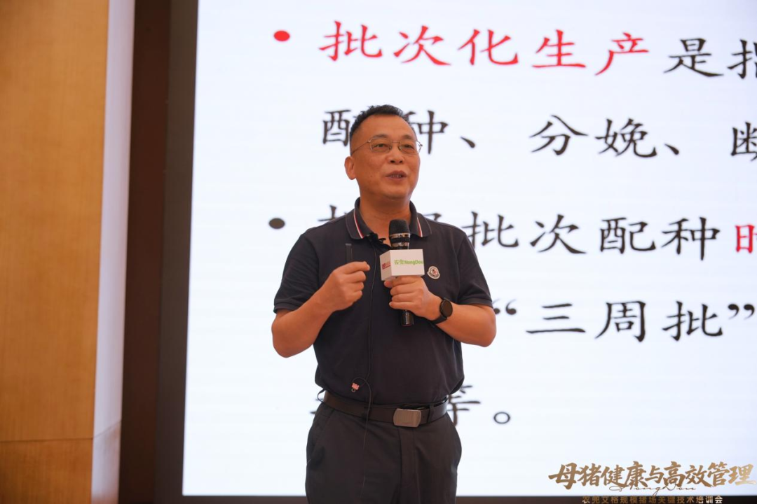 张守全教授(华南农业大学、宁波第二激素厂猪繁殖领域首席专家)重点讲解了猪场批次化生产对提升繁殖效率的作用,指出4周批在疫病防控和产能提升上优势显著,不同批次模式需结合猪场栏舍、猪苗流向等实际情况选择。报告分析了批次化生产中仔猪断奶体重偏轻、后备猪更新不足的核心问题,介绍了激素调控同期发情排卵的关键技术,以及选择可靠激素、把控使用细节的重要性。报告还强调要重视母猪乳腺发育的三个关键阶段,做好妊娠期精准饲喂和哺乳期乳腺发育促进,同时需高效落实栏舍周转、诱导分娩等管理措施,及时淘汰空反流母猪以保障批次化生产效率。