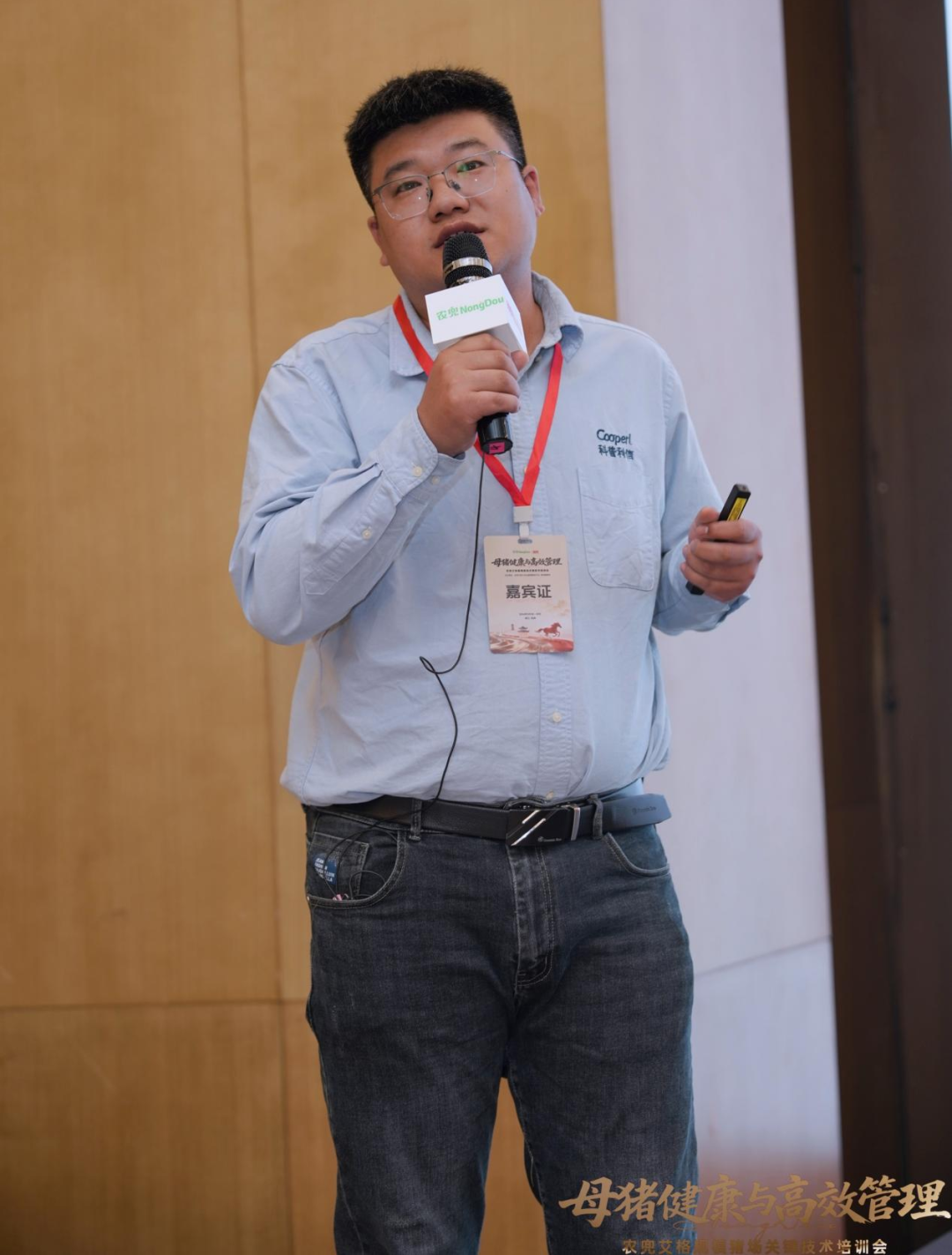 科普利信高级技术支持经理吴学智结合规模猪场种群管理经验,讲解种猪选育、母猪群更新优化、繁殖性能提升等关键内容,明确了后备猪的生长速度、初配日龄等核心培育标准,以及背膘测量的实操方法和胎龄结构的优化要求。报告详细讲解了母猪妊娠阶段的精准饲喂策略,通过分阶段测背膘调整喂量,同时介绍了提升排卵质量、降低胚胎损失的营养添加和管理手段。报告还重点阐述了产房的精细化管理要点,包括母猪上产准备、哺乳期饲喂曲线、仔猪初乳摄取保障,以及寄养、温湿度控制等提升仔猪成活率的关键措施。