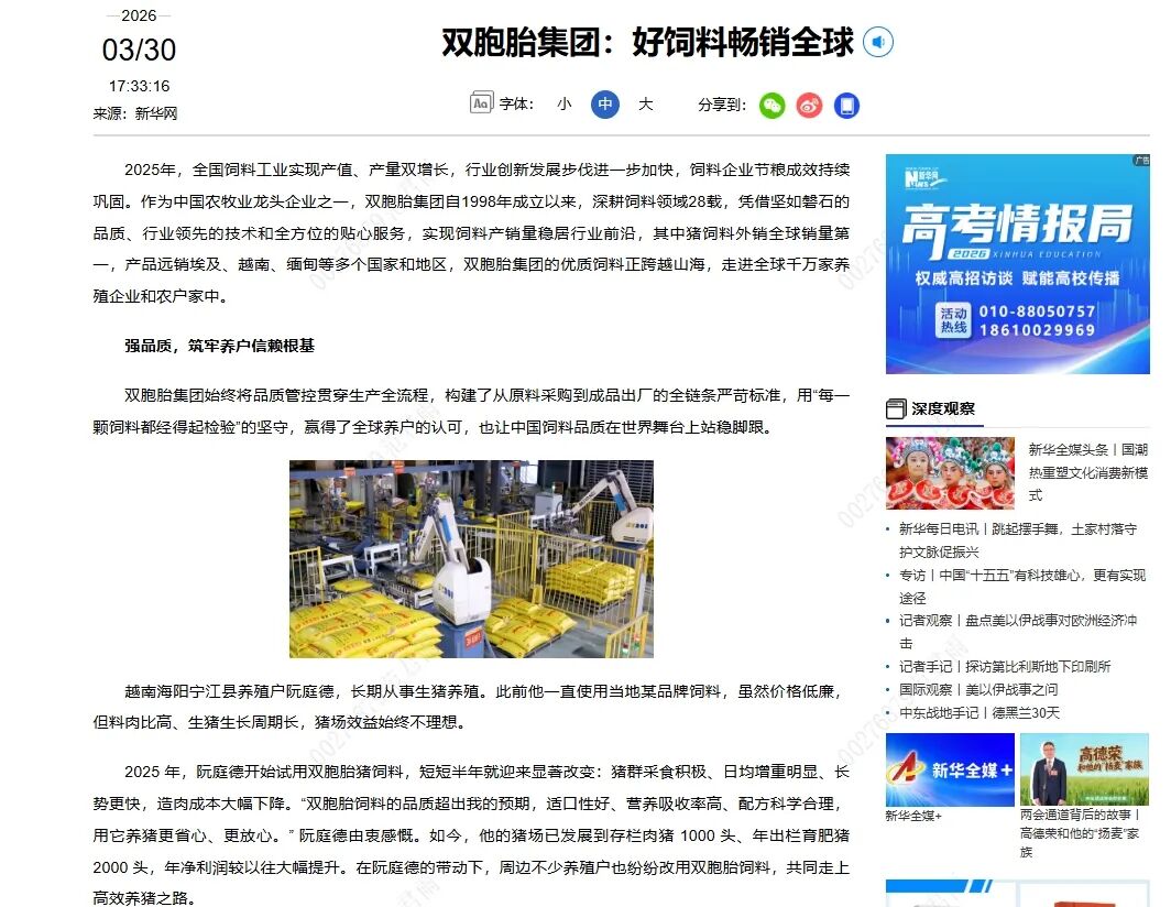 3月30日,新华网推出《双胞胎集团:好饲料畅销全球》,报道聚焦双胞胎集团 28 年深耕饲料领域的发展成果,从品质、技术、服务三大核心维度,展现其作为中国农牧业龙头企业的全球竞争力。