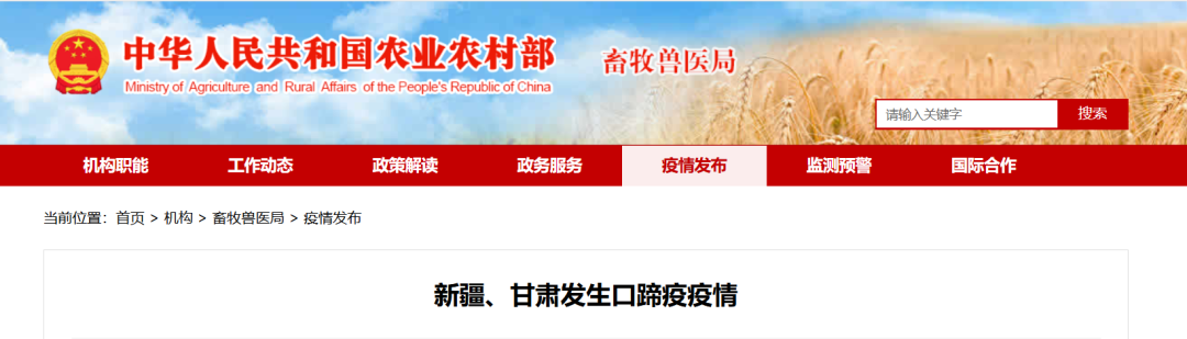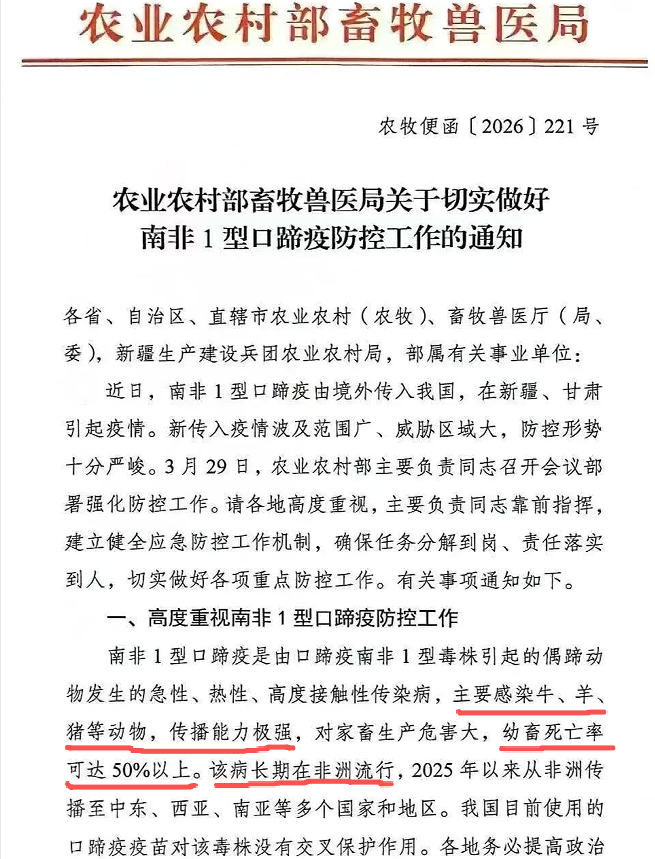 农业农村部畜牧兽医局于2026年3月30日发布了《关于切实做好南非1型口蹄疫防控工作的通知》(农牧便函[2026]221号),针对近期南非1型口蹄疫由境外传入我国并在新疆、甘肃引发口蹄疫疫情的严峻形势,部署了全面的防控工作。