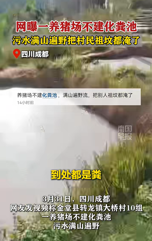 这事儿发生在3月31日。有热心网友拍下视频发到网上,画面里粪水直排进简易水池,到处是黑乎乎的污水,隔着屏幕都能闻到那股味儿。村民反映,这家养猪场连像样的化粪池都没有,既不过滤也不做无害化处理,直接挖了几个坑塘就把沼液往里灌。附近乡亲们受不了,有人家里的井水变味了,更让人上火的是,有村民家祖坟都被污水泡了。在农村,这是大忌,搁谁身上都接受不了。