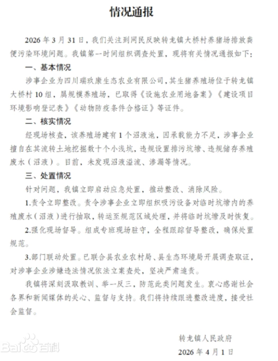 当地政府反应还算快。第二天,金堂县转龙镇人民政府就发了通报。涉事企业叫四川瑞玖康生态农业有限公司,养猪场在大桥村10组,规模不小,而且手续看着还挺全——设施农业用地备案、环评登记表、动物防疫条件合格证,一样不少。可现场一查,问题就露馅了:全厂只建了1个沼液池,容量根本不够用。企业就擅自在自己流转的土地上挖了几十个小浅坑,用来存沼液。官方通报里说“未发现沼液溢流、渗漏”,但那些临时坑塘本身就是违法的,污水早就影响了周边环境。