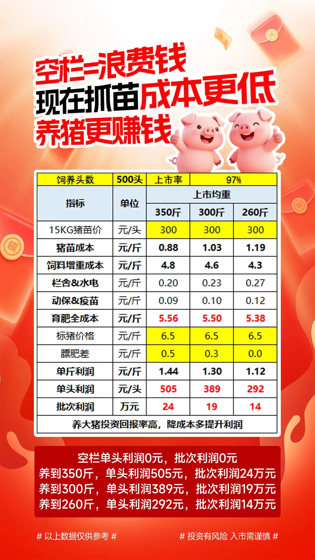 现在补栏,养至四季度出栏,完美对接中秋、国庆双节备货与年末腌腊消费旺季。踩中全年最佳盈利窗口。按当前行情测算,下半年出栏猪价有望达到6.5元/斤,加上标肥差,每只猪最高可赚500元左右,500头猪单批次利润可达14-24万元。