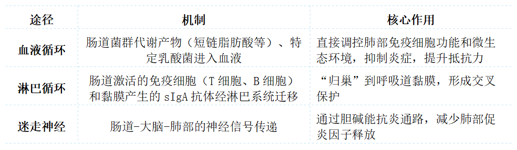 呼吸道感染通过迷走神经反射和炎症因子风暴反向影响肠道功能;而肠道免疫调节也可通过肠-肺轴影响呼吸道结局。