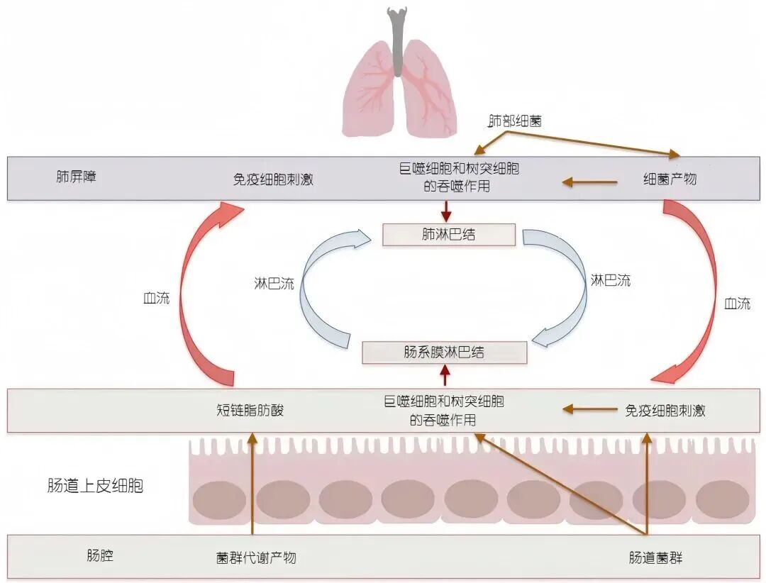肠道菌群失衡导致内毒素(细菌脂多糖LPS)易位,可直接诱发肺部炎症反应。